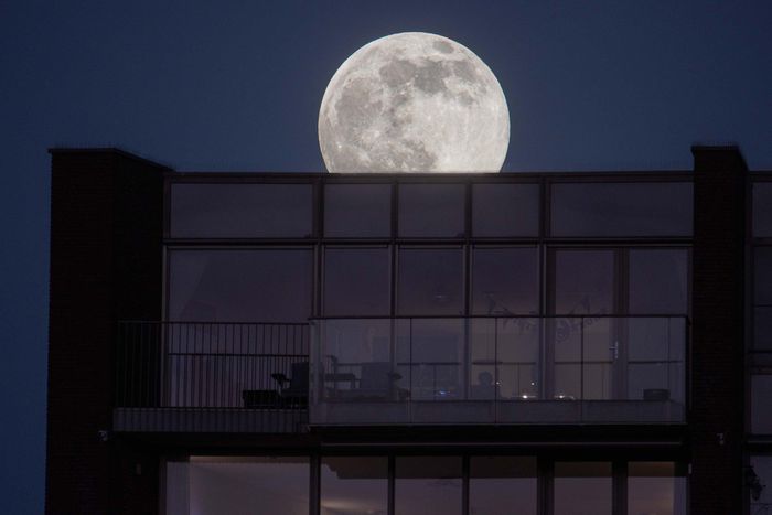 Hình ảnh Trăng sói lấp ló đằng sau một khu dân cư gần Eindhoven ở Hà Lan. Ảnh: Nicolas Economou / Nurphoto / Rex / Shutterstock.
