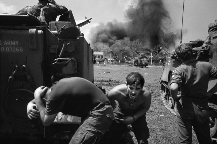 Vẻ hoảng hốt của lính Mỹ tỏ ra hốt hoảng trước một vụ nổ xảy ra ở cách đó khá xa, 1968. Ảnh: Philip Jones Griffiths/Magnum.