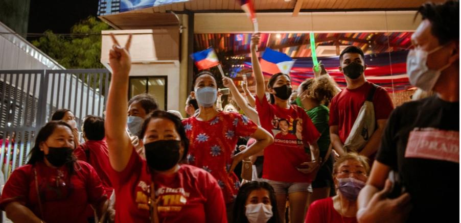 Người ủng hộ ông Marcos bên ngoài trụ sở chiến dịch tranh cử của ông tại Manila vào tối 9/5. Ảnh: New York Times.