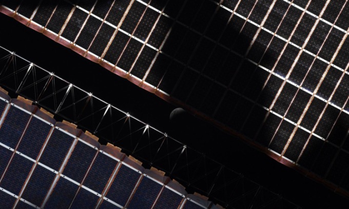 Phi hành gia của Cơ quan Vũ trụ châu Âu chia sẻ ảnh chụp Mặt Trăng bị che khuất một phần ló ra giữa những tấm pin mặt trời.
