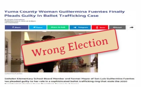 The claim appeared in an article published by The Gateway Pundit on June 2, 2022, titled "Yuma County Woman Guillermina Fuentes Finally Pleads Guilty In Ballot Trafficking Case." It opened: