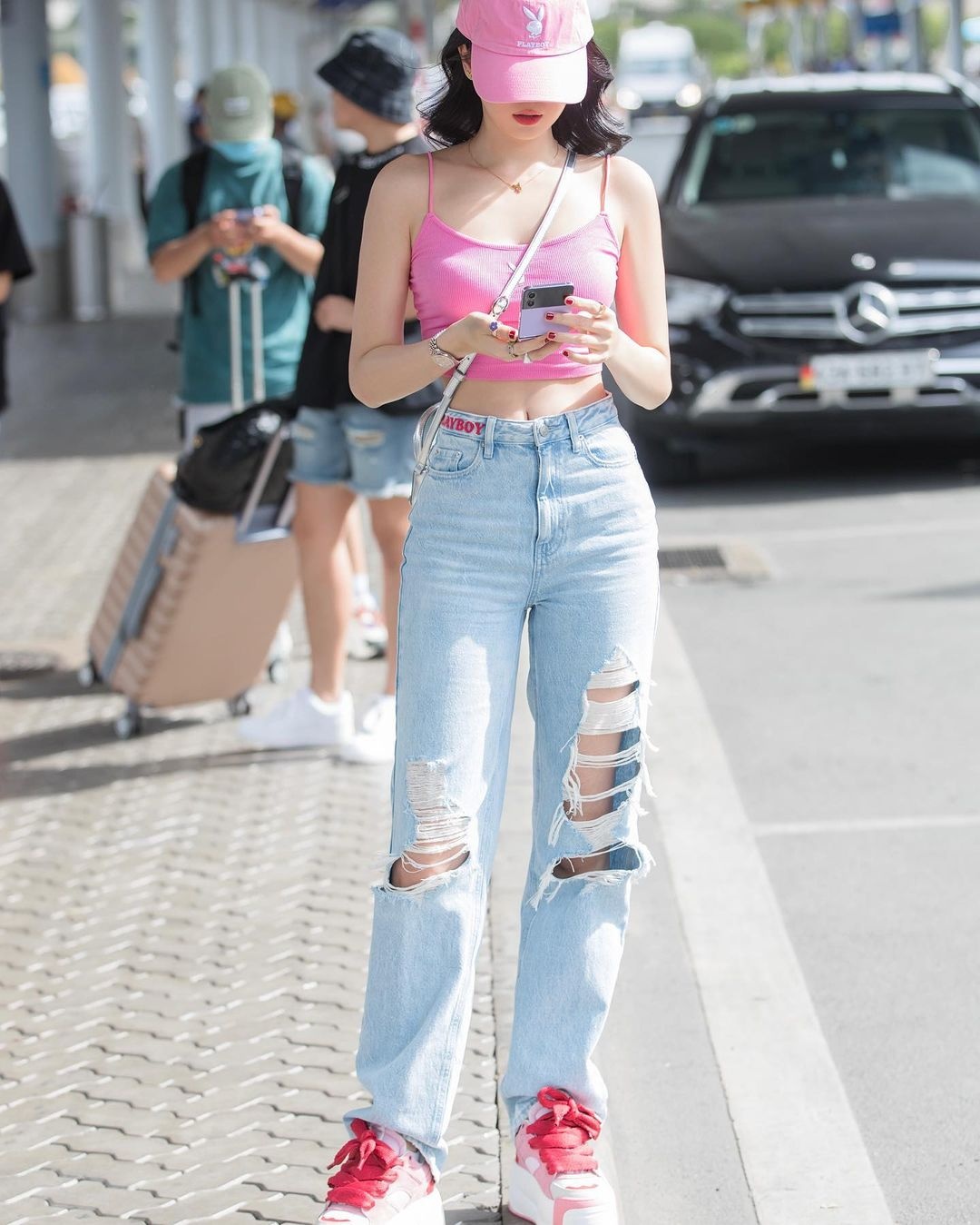 Vẫn là bikini, nhưng cách phối đồ của cô nàng khiến bộ cánh vừa đủ kín khi đi ra ngoài nhưng vẫn sexy và đậm chất quyến rũ khi đi biển. Ngọc Trinh diện mốt quần cạp trễ đang làm mưa làm gió khi chiếc quần rộng thùng thình được kéo xuống qua rốn để lộ quần trong bé xíu.