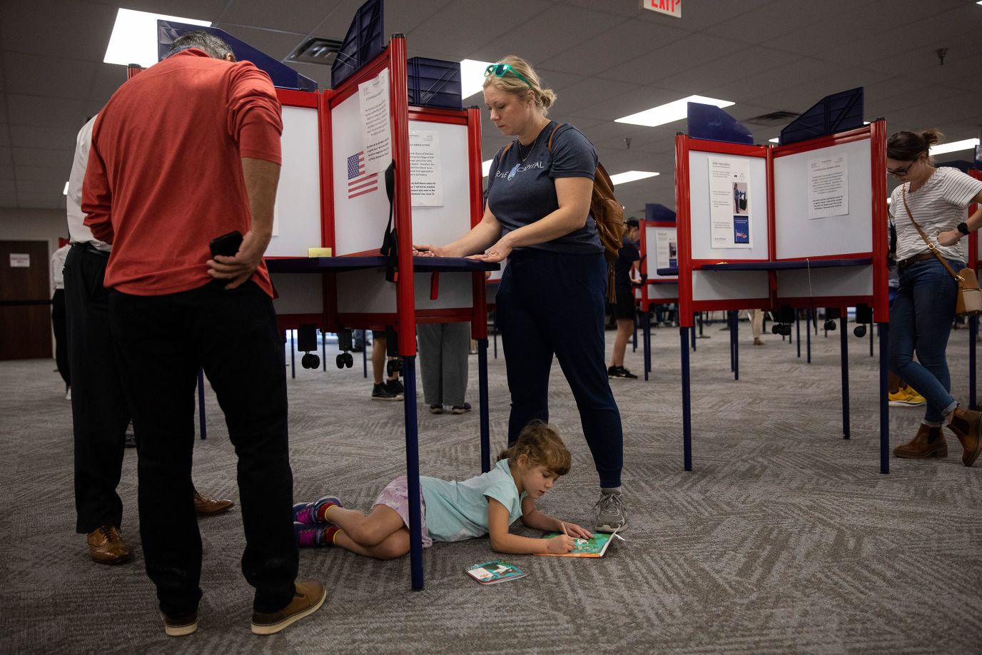 Bé gái nằm chơi dưới sàn nhà trong khi chờ mẹ bỏ phiếu trong cuộc bầu cử giữa kỳ ở Mỹ. Ảnh AP