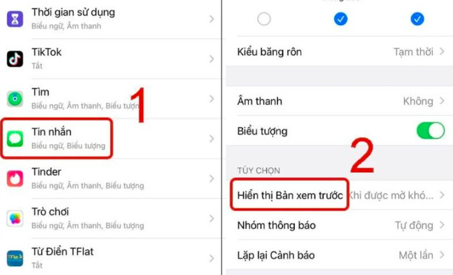 Bạn chọn Không để nội dung tin nhắn không hiển thị bản xem trước tại màn h́nh khóa hay thanh thông báo.