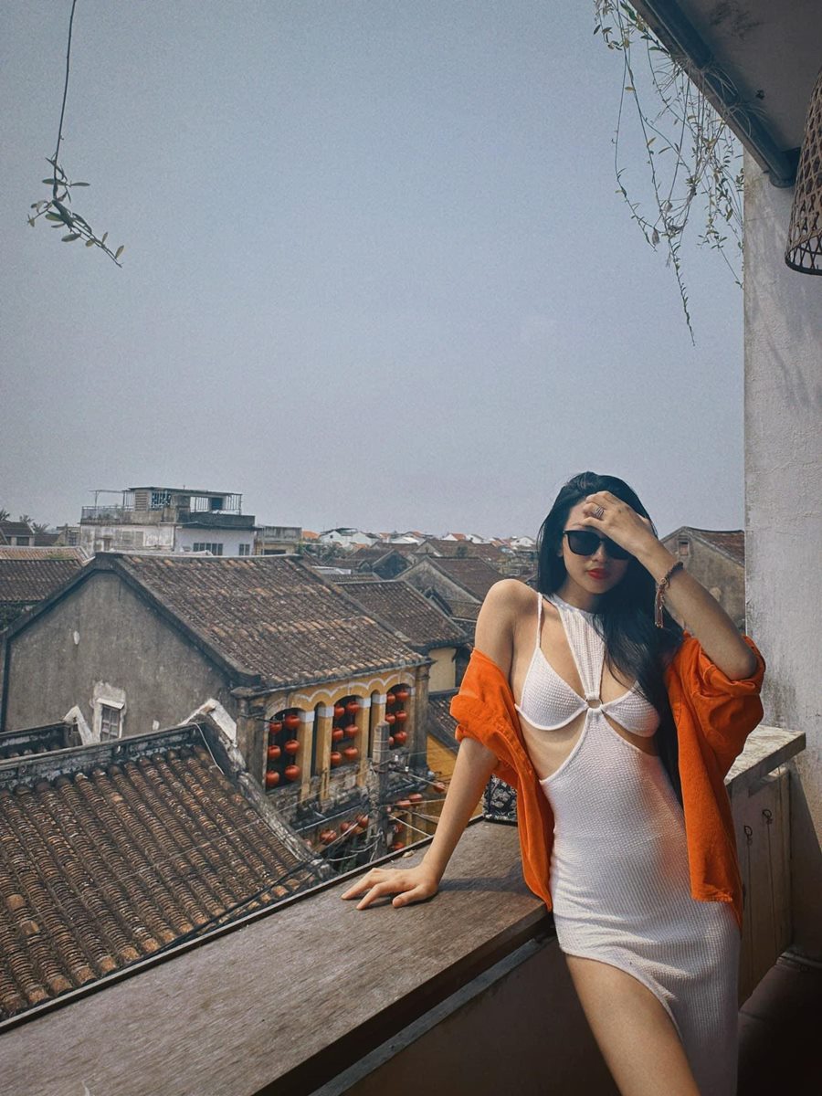 Trong chuyến đi gần đây đến Hội An, Anh Thư tiếp tục thể hiện sự "chơi trội" khi mặc váy body cut out. Thiết kế này tôn lên những đường cong nóng bỏng của cô. Cô kết hợp váy body với áo sơ mi màu cam nổi bật và đôi giày tông xuyệt tông để tạo điểm nhấn thú vị.