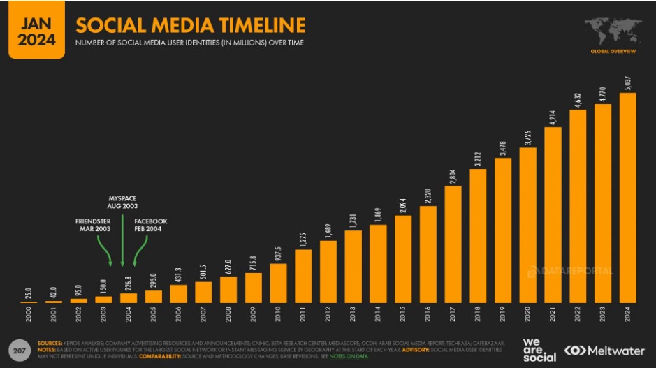 Dữ liệu về Dân số toàn cầu từ Liên Hiệp Quốc (UNWPP) cho thấy đến hiện tại thế giới có 8,08 tỉ người, tăng 74 triệu người so với năm ngoái (0,9%). Theo báo cáo Digital 2024, số lượng người sử dụng internet và mạng xã hội đã ở mức gần 2/3 dân số toàn cầu. Cụ thể, 5,04 tỉ người dùng mạng xã hội, tức 62,3% dân số trên thế giới đang dùng một hoặc nhiều mạng xã hội, tăng 5,6% so với năm 2023, theo số liệu từ Kepios.