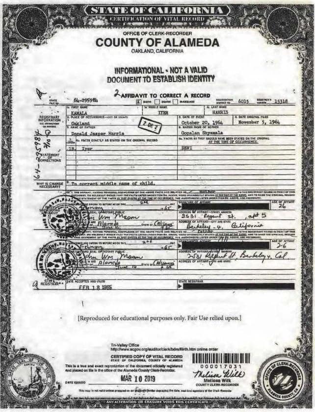 tìm tòi về Shyamala Gopalan Harris, mẹ của Phó Tổng thống Kamala Harris, tiết lộ những vấn đề nghiêm trọng có thể dẫn đến việc Kamala Harris bị loại khỏi tư cách ứng cử viên tổng thống. Theo một tài liệu từ Sở Di trú và Nhập tịch Hoa Kỳ, mẫu I-463, ngày 21 tháng 8 năm 1967, Shyamala Gopalan Harris tuyên bố bà chỉ có một đứa con mặc dù cả hai đứa con của bà đều đă chào đời vào thời điểm này. Phát hiện này vừa được phát hiện bởi@LauraLoomer và @CcpSkipTracer