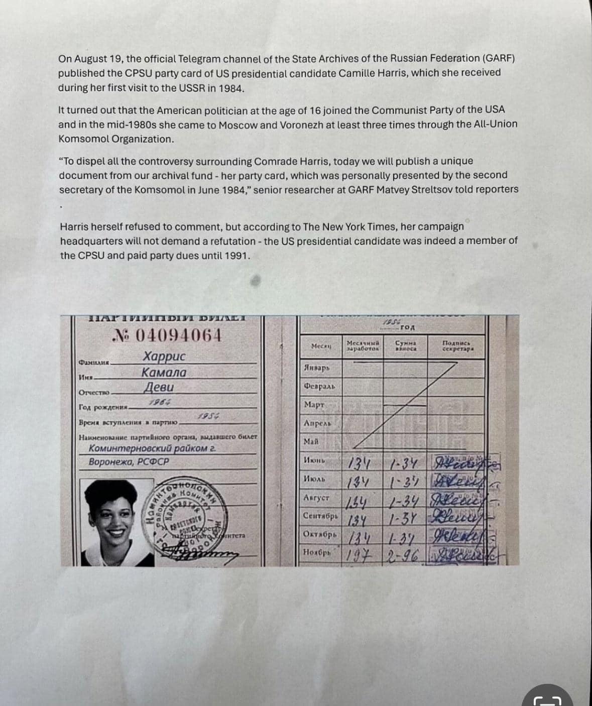 -Thêm một tài liệu nữa nói Kamala là đảng viên của đảng cộng sản Mỹ vào giữa năm 1980, từ năm 16 tuổi. Đã từng đến Nga hơn 3 lần và có đóng tiền đảng phí đến 1991.
