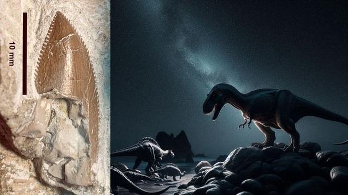 Một mẫu vật là răng của Caletodraco cottardi và ảnh đồ họa mô tả chân dung của khủng long nhóm Abelisauridae - Ảnh: Eric Buffetaut; Minh họa AI: Anh Thư