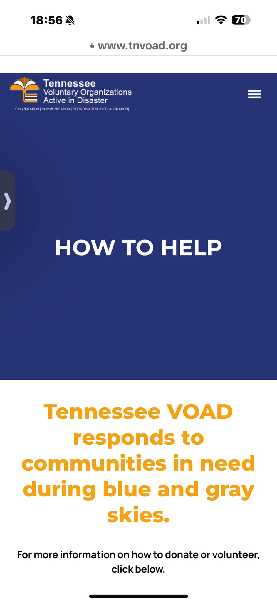 Trong khi các cộng đồng địa phương đánh giá cao tinh thần t́nh nguyện trong thảm họa, vui ḷng KHÔNG gửi các khoản quyên góp mà không được chính quyền tiểu bang hoặc địa phương yêu cầu. TEMA không chấp nhận t́nh nguyện viên hoặc khoản quyên góp cho đến khi nhiệm vụ an toàn tính mạng hoàn thành. Người dân Tennessee, không tự triển khai đến các khu vực thảm họa - điều này sẽ cản trở các hoạt động ứng phó và phục hồi. Một quỹ với East Tennessee Foundation đă được thành lập để quyên góp tiền cho các quận bị ảnh hưởng: https://