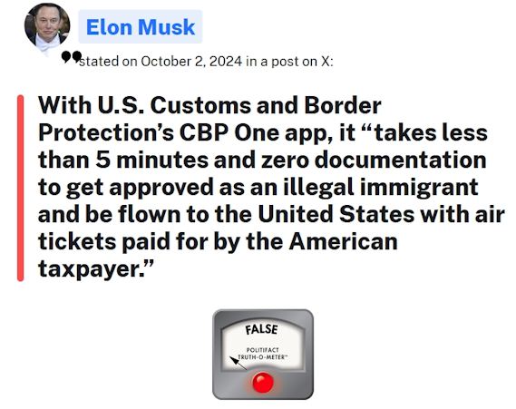 Musk’s post said people using the CBP One app will "be flown to the United States with air tickets paid for by the American taxpayer." We have previously checked a claim that immigrants were able to use the app to get free flights to the US and rated it False.