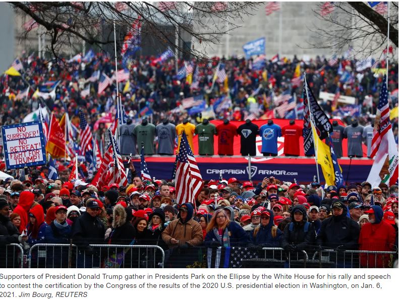 Những người ủng hộ Tổng thống Donald Trump tập trung tại Công viên Tổng thống trên đường Ellipse gần Nhà Trắng để tham dự cuộc mít tinh và bài phát biểu phản đối việc Quốc hội chứng nhận kết quả cuộc bầu cử tổng thống Hoa Kỳ năm 2020 tại Washington, vào ngày 6 tháng 1 năm 2021.