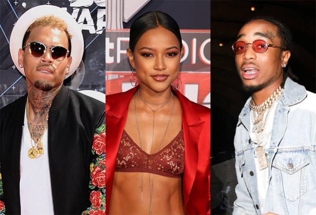 Chris được cho là nổi giận khi phát hiện cậu bạn Quavo (bên phải) đang yêu Karrueche Trần.