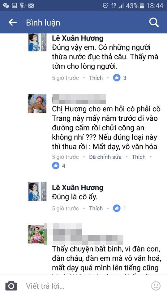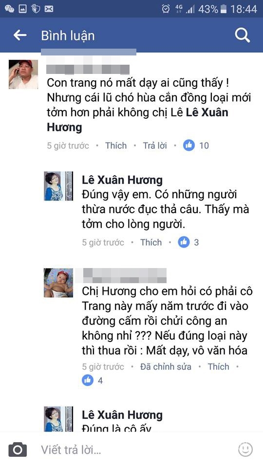 Mới đây, Trang Trần tìm ra những bình luận, comment của Lê Xuân Hương để có cơ hội mỉa mai, đá đểu nghệ sĩ này. Trang Trần chia sẻ: “Người lớn dạy bảo sao phải học và làm theo! Cũng giống như việc like, comment của những người có lời lẽ vô văn hoá xúc phạm chồng cũ, vợ mới của chồng cũ mới là cách sống văn hoá! Đừng bấm phím hay nói ra miệng mang tiếng ác, chỉ like, comment chửi thủ dâm tinh thần là đủ. Hành động bấm like là kết quả của suy nghĩ ok? Dạ không biết em mà chị khẳng định như đinh đóng cột, lạy chị! Chị nên nhớ hành động xoá comment không phải là có thể xoá dấu vết. Facebook không có chức năng xoá tương tác. Chị cứ làm việc và làm đúng, đừng đắn đo bởi khi an ninh mạng họ dùng công cụ tìm kiếm thì sẽ thấy có tương tác hay không”.