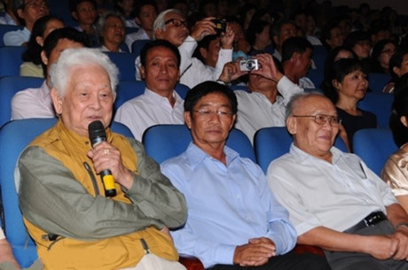 Nhạc sĩ Phạm Duy nói về hoàn cảnh ra đời những ca khúc của mình trong một đêm nhạc của gia tộc họ Phạm được tổ chức ở TP.HCM năm 2011 - Ảnh: Tiểu Vũ
