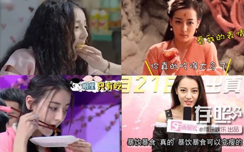 Triệu Lệ Dĩnh từng tiết lộ, niềm đam mê của cô là ăn uống. Chính vì thế, khi đảm nhận vai diễn Sam Sam trong phim Sam Sam đến rồi có nhiều cảnh quay ăn uống, người đẹp sinh năm 1987 không ngại ngần “ăn thả phanh”. Sau khi phim đóng máy, Lệ Dĩnh tăng lên gần 4kg (ảnh trái trên và dưới). Khi đóng Yên chi, cô nàng Hoa Thiên Cốt rất hào hứng khi quay cảnh ăn (ảnh trên bên phải). Ngay cả tham gia show Thần tượng đến rồi mùa 1, nữ diễn viên Sở Kiều truyện cũng ăn uống rất ngon lành bất chấp lúc ghi hình hay nghỉ ngơi.
