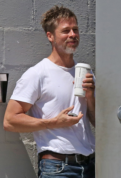 Brad Pitt rời quán cafe ở Los Angeles sau bữa trưa cùng bạn bè hôm 6/7. Anh cầm cốc cafe đá quay về studio điêu khắc để tiếp tục làm việc.