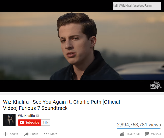 "Gangnam Style" – Ca khúc giúp PSY trở thành siêu sao quốc tế mới đây đã bị "See You Again" (Wiz Khalifa ft. Charlie Puth) vượt mặt về số lượt xem trên Youtube. Như vậy, bản OST đình đám của "Fast & Furious 7" đã trở thành video được xem nhiều nhất trên thế giới với 2.894.763.781 lượt (tính đến ngày 11/7).