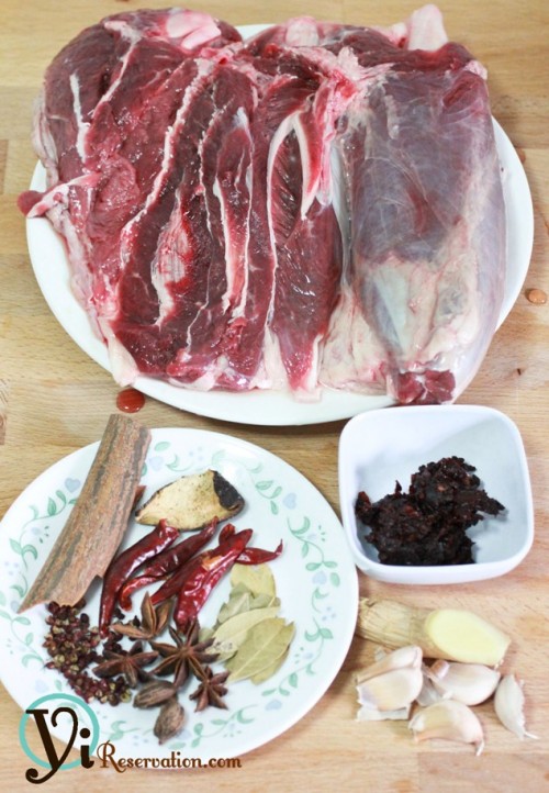 - Gia vị khô: 4 hoa hồi; 6 trái ớt khô; 1 thìa cà phê hạt tiêu Tứ Xuyên (có thể dùng tiêu thường); 1 thanh quế; 1 thìa cà phê hạt thì là; 2 nhánh đinh hương; 1 vỏ cam khô; 4 lá nguyệt quế; 2 quả bạch đậu khấu đen
