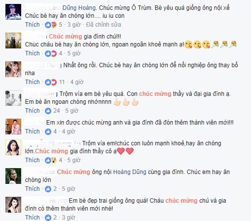 Bên cạnh dòng trạng thái bày tỏ niềm vui sướng vì đón thành viên mới trong gia đình, ông nội Hoàng Dũng cũng không quên khoe ảnh cháu trai kháu khỉnh của mình. Cậu bé này là kết tinh tình yêu của Hoàng Duy - con trai NSND Hoàng Dũng và vợ Hồng Trang.