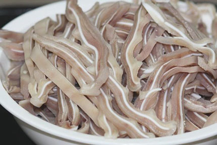 Dùng dao tách bỏ phần thịt xung quanh đáy tai. Sau đó xát muối + giấm hoặc muối + chanh mạnh tay vào phần đáy tai để làm mất mùi hôi, rửa lại thật sạch bằng nước. Cuối cùng, hòa một ít giấm hoặc chanh vào nước, cho tai heo vào ngâm khoảng 10 phút. Vớt ra để ráo, đảm bảo lỗ tai heo của bạn vừa sạch vừa trắng.