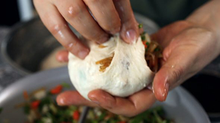 4. Múc một muỗng nhân mặn cho vào giữa miếng bột. Gói ghém phần nhân mặn thiệt khéo và thiệt tròn, nhưng đừng để chiếc bánh bị bể. Xem hình.