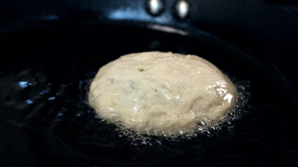 5. Thả cục bánh vào chảo dầu nóng. Khi mặt dưới vàng, lật ngược chiếc bánh. Dùng chiếc xẻng kim loại để ép dẹp chiếc bánh rán. Xem hình.