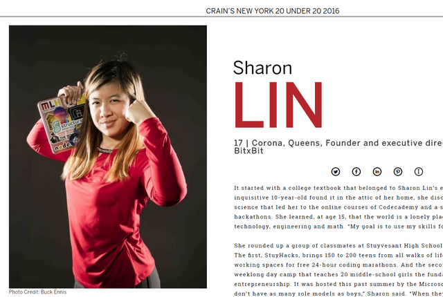 Sharon Lin trong danh sách 20 doanh nhân trẻ dưới 20 tuổi của tạp chí doanh nghiệp Crain.