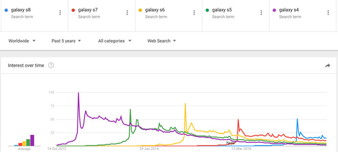 Đó cũng không phải là câu chuyện của vài lần ra mắt gần đây mà diễn ra trong vài năm qua. Số liệu trên Google Trends chỉ rõ điều này, chẳng hạn màn ra mắt điện thoại Galaxy S.