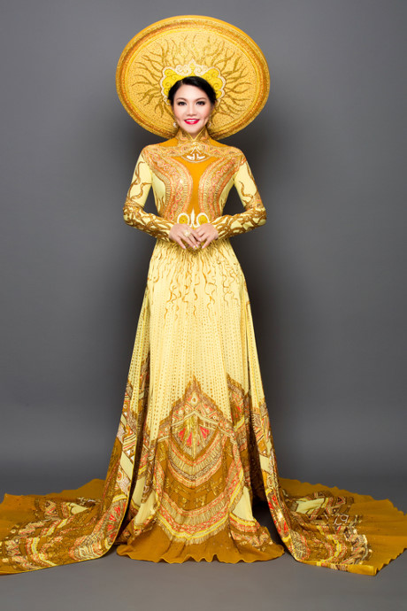 Nữ nghệ sĩ mặc trang phục truyền thống mang họa tiết biểu trưng của thời kỳ Âu Lạcvà đội mấn nặng đến 5 kg.