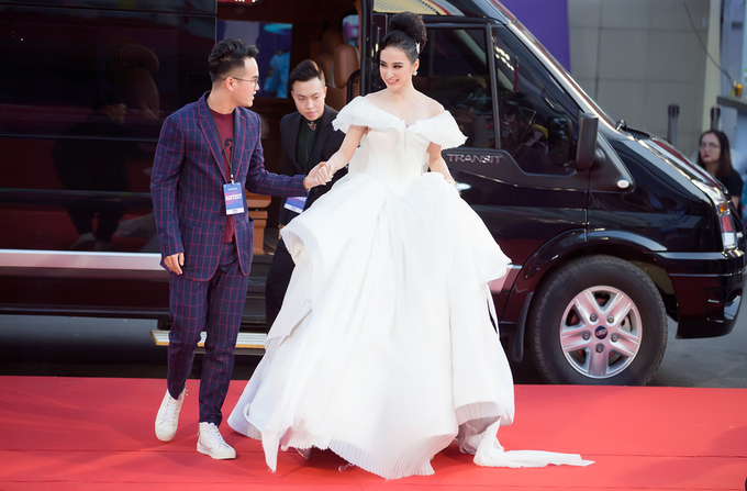 Angela Phương Trinh đến sự kiện bằng xe limousine. Nhạc sĩ Khắc Hưng (trái) dắt tay cô trên thảm đỏ.