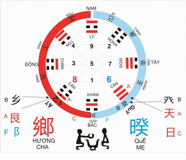 Minh họa sự tương thích của hai chữ Quê Hương với Lạc thư – Hậu thiên bát quái.