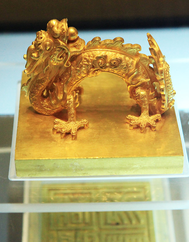 Ấn Quốc gia bảo tín bằng vàng, niên hiệu Gia Long (1802 – 1919). Ấn được dùng đóng trên các văn kiện triệu tập tướng lĩnh, phát động binh sĩ, trưng binh nhập ngũ và các văn kiện hành chính quan trọng. Ấn có cạnh 11,7x11,7cm, cao 9cm, dày 1,65cm