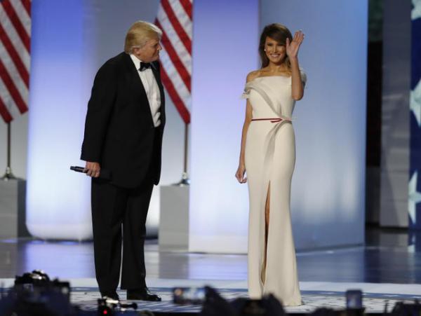 Đệ nhất phu nhân Mỹ Melania mặc áo choàng đen mang thương hiệu thời trang Pháp Hubert de Givenchy kết hợp với chiếc váy ngắn đen thương hiệu Dolce & Gabbana, và ví da cầm tay Christian Dior trong buổi tiếp