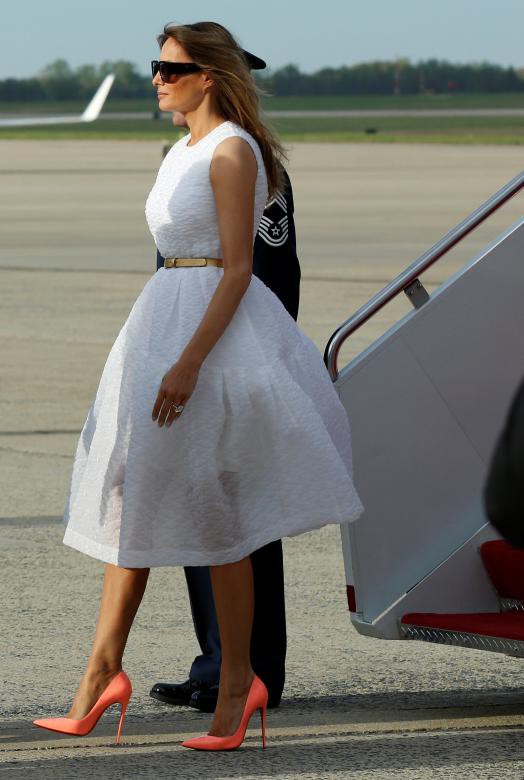 Bà Melania trẻ trung trong chiếc váy màu đỏ và đôi giày cùng tông. (Ảnh: Reuters)