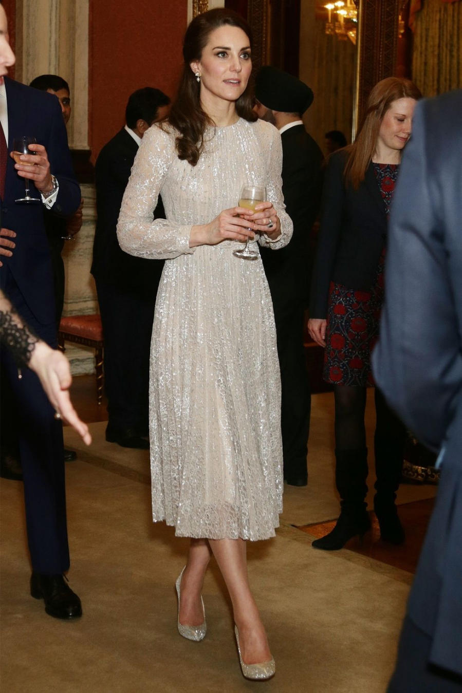 Công nương Kate Middleton luôn được đánh giá cao về phong cách thời trang mỗi khi xuất hiện cùng Hoàng tử William. Cô thường kết hợp tinh tế giữa màu sắc và kiểu dáng trang phục nhằm thể hiện vẻ đẹp sang trọng, thanh lịch của bản thân. Những bộ cánh người đẹp lựa chọn thường đến từ các nhà mốt danh giá trên thế giới, đơn cử như mẫu đầm ren đính kết lấp lánh tông màu rượu vang trắng của thương hiệu Anh quốc Erdem.