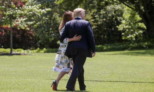 Trước khi lên chiếc Không lực Một ở bãi cỏ phía nam Nhà Trắng để đến căn cứ Andrews, Maryland hôm 24/5, Tổng thống và Đệ nhất phu nhân Mỹ dường như có tâm trạng tốt. Hai người tỏ ra thân mật, ôm lưng nhau, sau đó Melania lên máy bay trước. Trump đứng lại để chào đám đông tiễn họ.