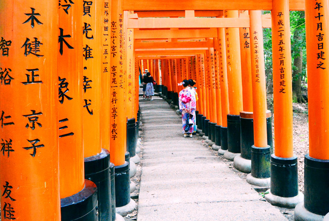 Nhắc tới Kyoto là nhắc tới những ngôi đền có tuổi đời hàng nghìn năm. Nhưng ngôi đền được check in nhiều nhất có lẽ là Fushimi Inari-taisha - nơi nổi tiếng với hàng nghìn chiếc cổng torii màu đỏ đặc trưng tạo thành một đường hầm đỏ au, nổi bật. Đây là vật phẩm cúng tế của các cá nhân, công ty cho ngôi đền, mong gặp may mắn trong việc kinh doanh. Theo tín ngưỡng của Thần Đạo, chiếc cổng torii được xem như cửa ngõ đi vào thế giới của thần linh, nơi chuyển tiếp giữa phàm trần và cõi linh thiêng. Còn màu đỏ rực tượng trưng cho mặt trời và sức mạnh. 10.000 chiếc cổng torii xếp thành một "đường hầm" dài tới 4 km và vẫn tiếp tục được nối dài.