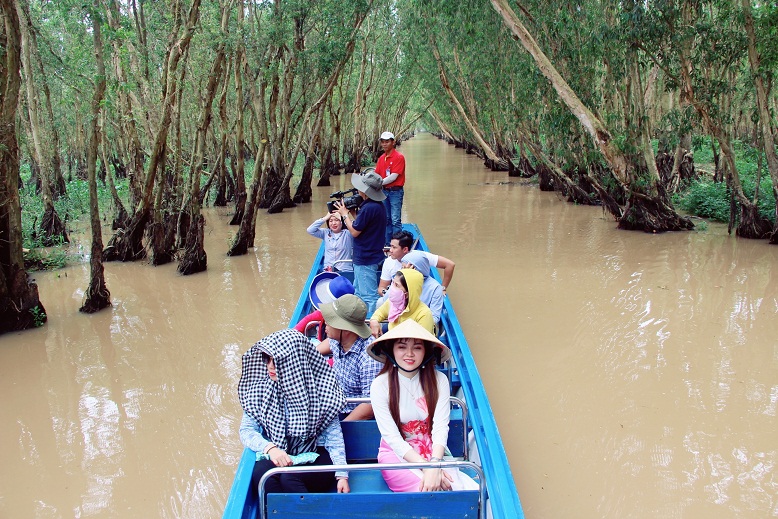 Du khách di chuyển bằng xuồng máy để tham quan phong cảnh rừng tràm.