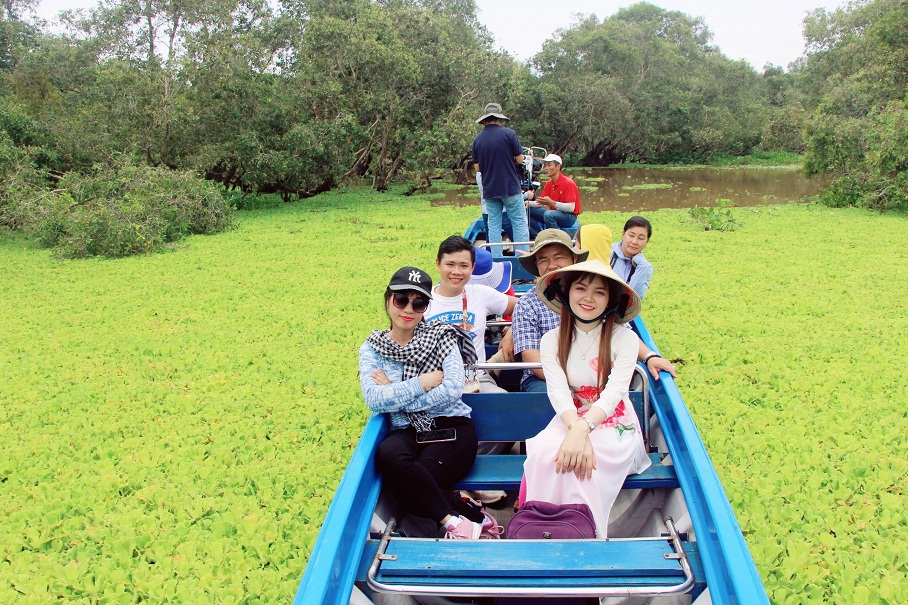 Du khách di chuyển bằng xuồng máy, lướt trên mặt bèo, tận hưởng cảnh thiên nhiên hoang sơ bao la của rừng tràm Trà Sư.