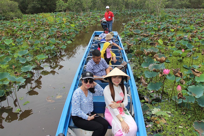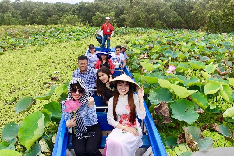 Đến đây, ngồi trên thuyền xé đôi con nước đi vào sâu bên trong khu rừng, khách du lịch không khỏi choáng ngợp với không gian toàn màu xanh của tự nhiên hiện ra trước mặt du khách đẹp như những bức tranh. Vào bên trong những cánh rừng tràm trên 10 năm tuổi, du khách đi thuyền máy "xé đôi" biển hoa sen bao la với trăm hoa đua sắc giống như lạc vào giữa không giang cổ tích. Đắm mình vào bức tranh phong cảnh tuyệt đẹp của biển hoa sen hồng thơm ngát hương, du khách hoà mình vào thiên nhiên, đắm say cùng đất trời và lướt mình theo con nước nổi.