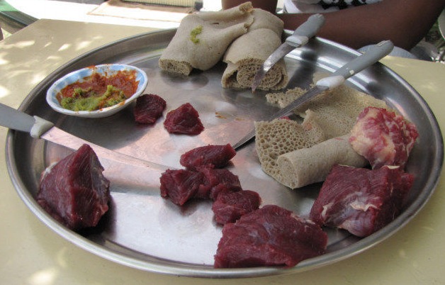 Cũng có nhiều nước trên thế giới ăn thịt không nấu, nhưng họ làm chín chúng bằng các loại gia vị hoặc để lên men qua thời gian…Nhưng ngoài món kitfo một đặc sản yêu thích của người địa phương gồm thịt bò tươi xay được cho thêm một số gia vị, hầu hết người Ethiopia thích ăn những miếng thịt bò sống nguyên được cắt cỡ vừa chấm với hỗn hợp bột ớt đỏ và thưởng thức ngon lành.