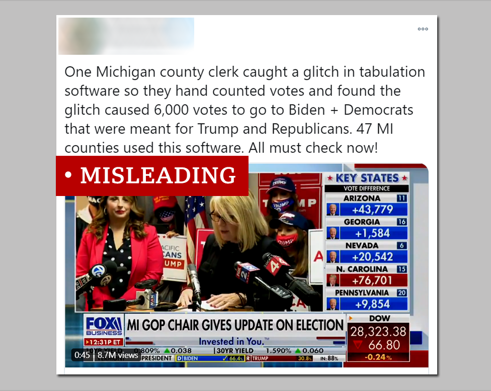 Các bài đăng đang được chia sẻ rộng rãi trên mạng cho thấy một trục trặc trong phần mềm kiểm phiếu được sử dụng ở Michigan đã dẫn đến việc hàng nghìn lá phiếu bầu cho Donald Trump được tính cho Joe Biden.
