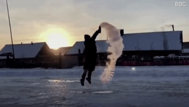 Khoảnh khắc nước sôi 100 độ C được hắt lên trời, lập tức đóng băng vì nhiệt độ quá lạnh, khiến người xem vô cùng thích thú.