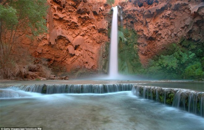 Thác nước Havasu chảy thành hai dòng khi đổ xuống hồ nước phía dưới. Nguồn nước ngọt của dòng thác phủ xanh lớp đất đá sẫm màu của hẻm núi vĩ đại nhất hành tinh.