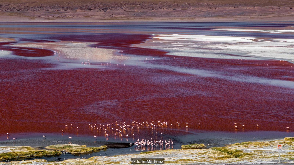 Cũng nằm trong khu bảo tồn và cách Sol de Manana khoảng 45 km, Laguna Colorada (hay còn gọi là đầm Đỏ) là hồ nước mặn nổi tiếng với sắc đỏ rực rỡ. Màu của hồ xuất phát từ tảo dunaliella salina và các trầm tích của sinh vật phù du. Ảnh: Juan Martinez.
