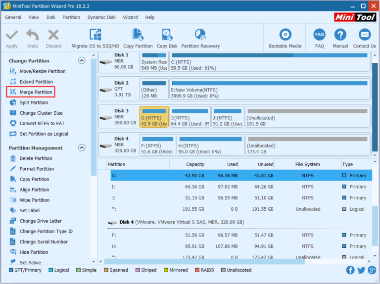 MiniTool Partition Wizard là công cụ quản lý phân vùng Windows hoàn chỉnh và tiên tiến giúp bạn quản lý ổ cứng chuyên nghiệp. Không chỉ có chức năng gộp mà MiniTool Partition Wizard còn có nhiều tính năng khác như chia phân vùng ổ cứng, chuyển đổi ổ GPT sang ổ MBR, chuyển đổi FAT32 sang NTFS và khôi phục phân vùng ổ cứng bị mất.