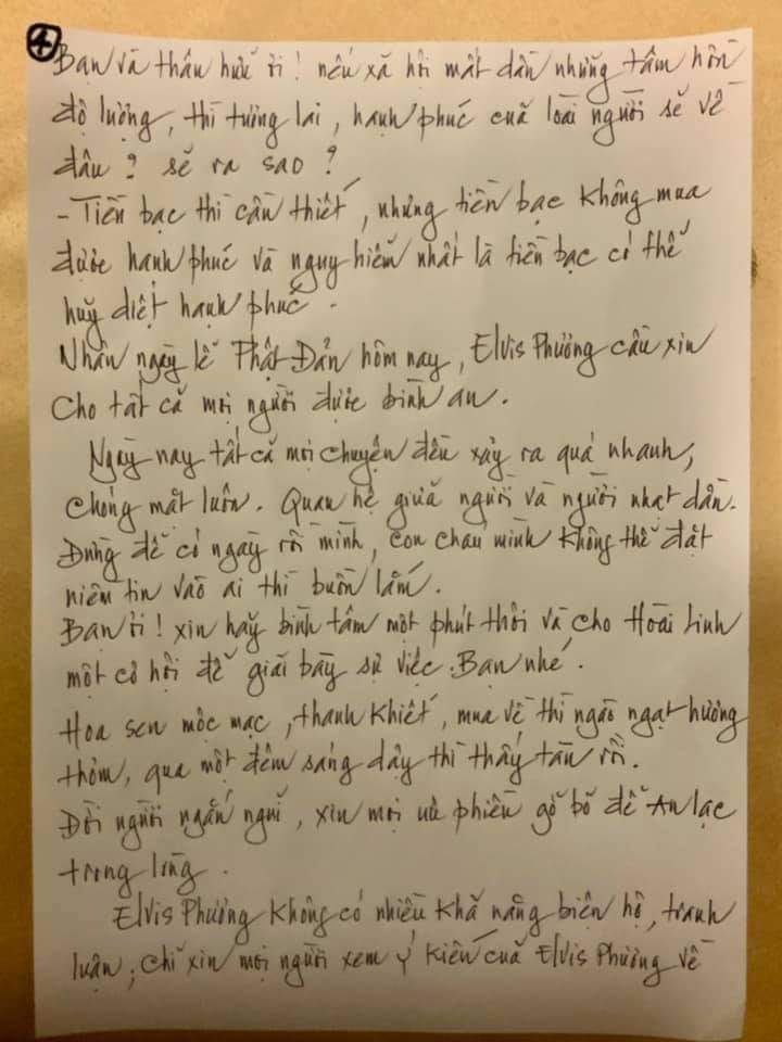 Khi viết những dòng chữ này Elvis Phương rất đắn đo, thứ nhất là viết trong cơn bão giận dữ bao trùm trong lúc này nhưng với sự suy nghĩ cả mấy ngày nay và vợ Elvis Phương có nói đời sống vô thường lắm "bố viết gì, làm gì mà bố thấy thoải mái thì bố cứ làm".