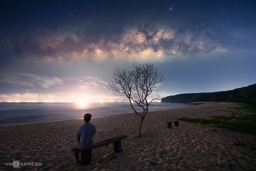 Tác giả bên cạnh "cây cô đơn" giữa màn đêm, mắt hướng về phía bầu trời đầy sao gần khu vực bãi biển Gành Đá Đĩa, An Ninh, Tuy An, Phú Yên.