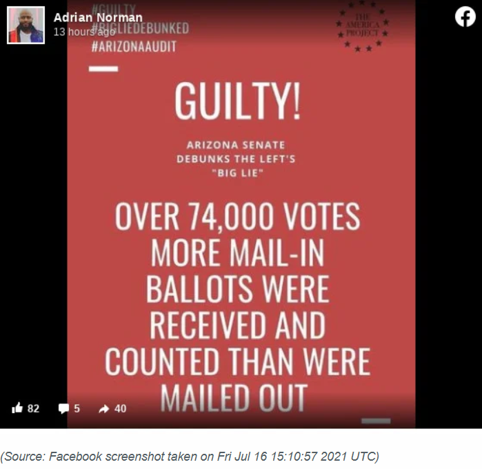 The claim appeared in a meme on Facebook on July 15, 2021. The meme was one in an apparent series by The America Project, an organization created by Patrick Byrne, the former CEO of Overstock.com. The group promotes the idea that the 2020 election was stolen or rigged and raises money to help fund audits, like the one taking place in Maricopa County. The meme reads: